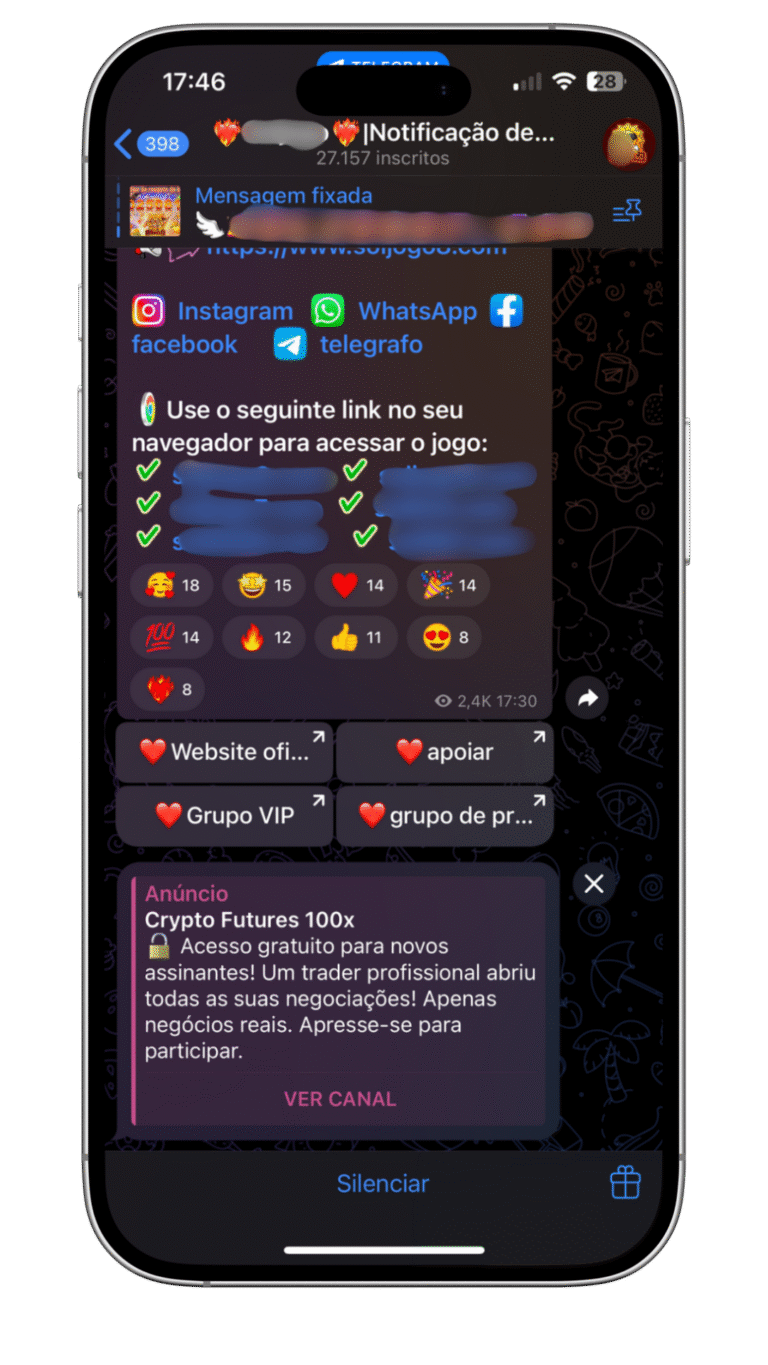 Nota: Evite enviar muitas mensagens em sequência (mais de 4 por minuto), para garantir o volume completo de reações e visualizações.